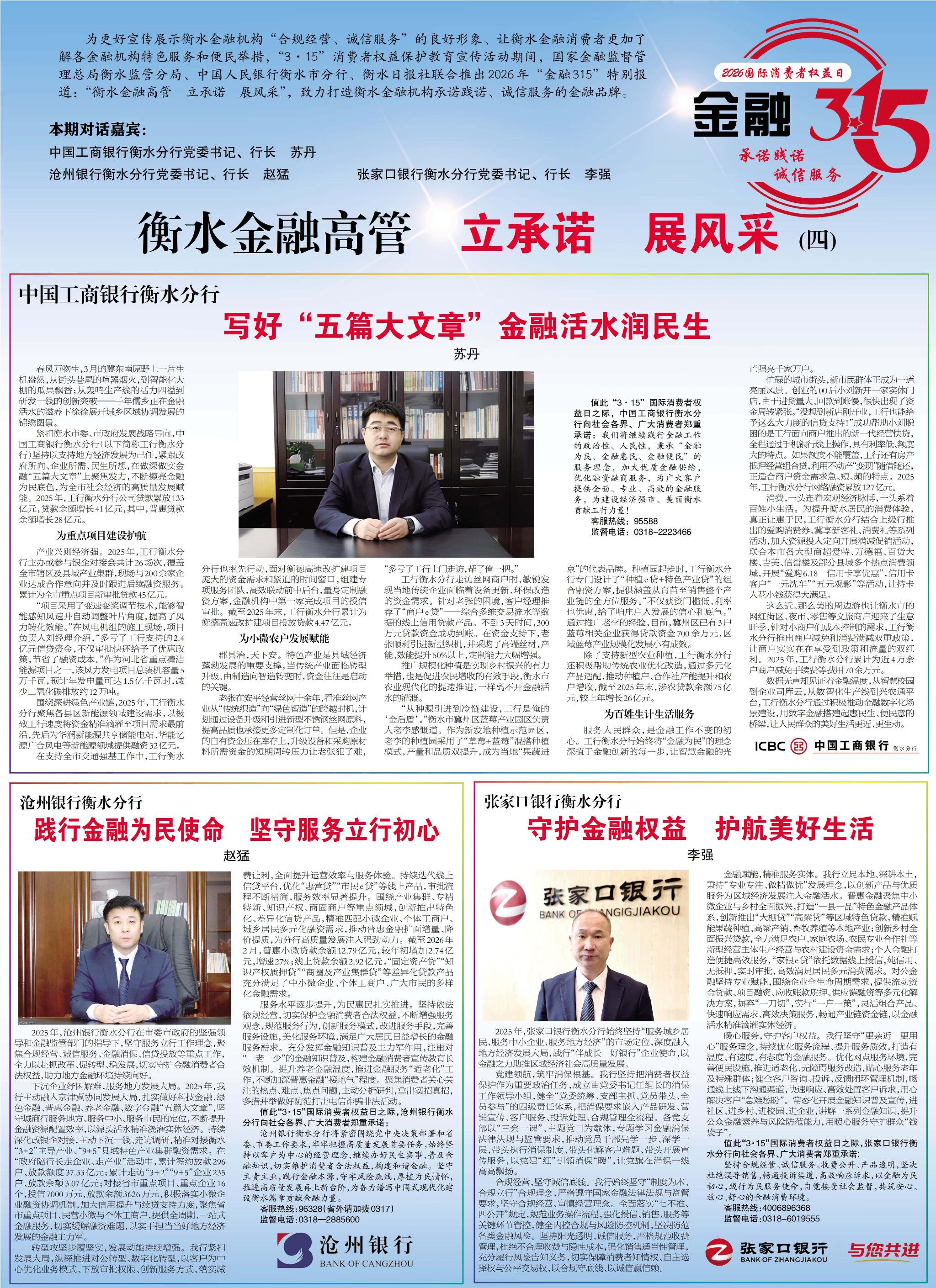 为更好地宣传展示衡水金融机构“合规经营、诚信服务”的良好形象、让衡水消费者更加了解各金融机构的特色服务和便民举措,“3·15”消费者权益保护教育宣传活动期间,国家金融监督管理总局衡水监管分局、中国人民银行衡水市分行、衡水日报社联合推出2026年“金融3·15”特别报道—“衡水金融高管 立承诺 展风采”,致力打造衡水金融机构承诺践诺、诚信服务的金融品牌。
